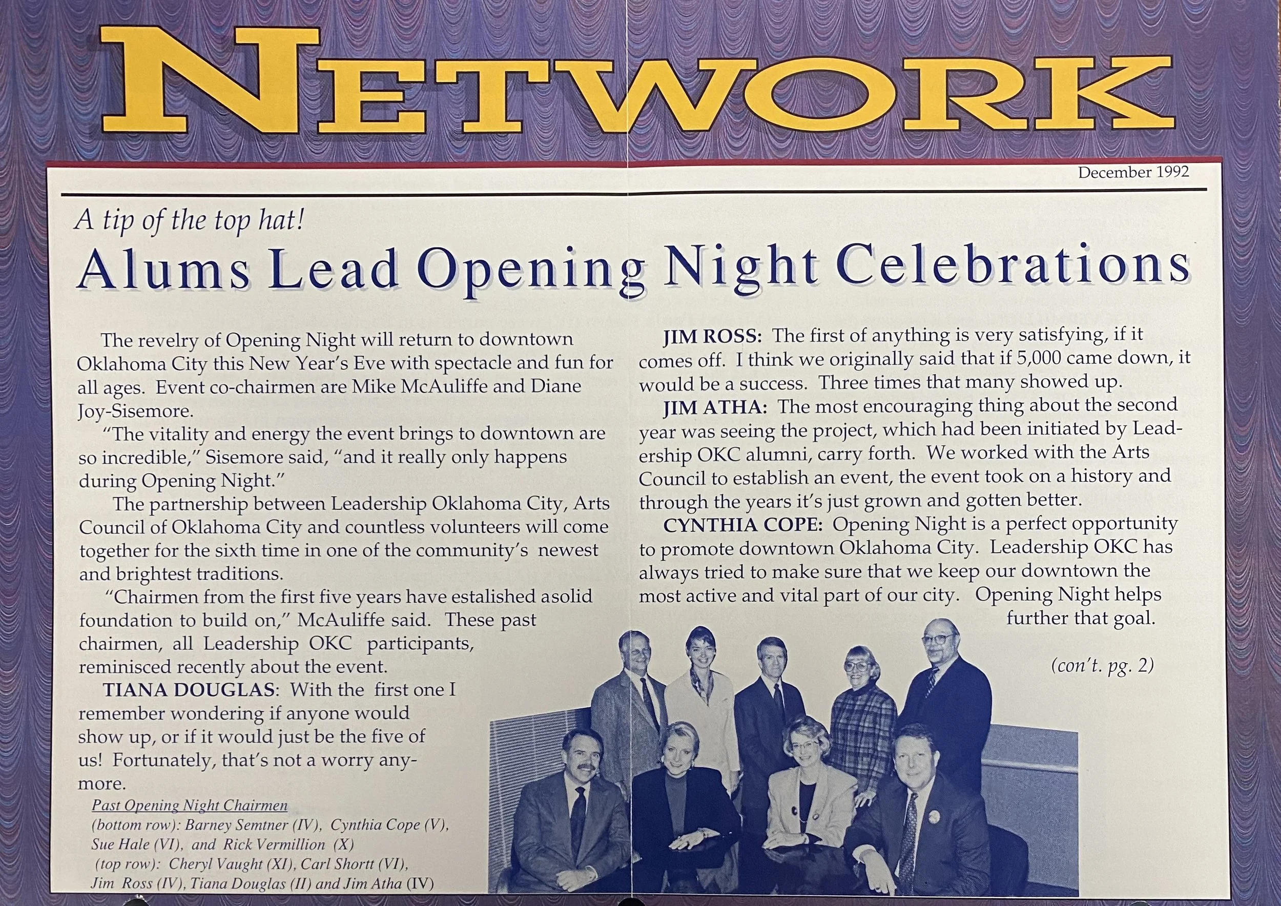 But in 1986, Leadership Oklahoma City grads Jackie Jones (Class I), Tiana Douglas (Class II), Jim Ross (Class IV) and other folks from the Arts Council of Oklahoma City visited Boston. Boston had been throwing an awesome party once a year and everyone in Boston was invited to come.